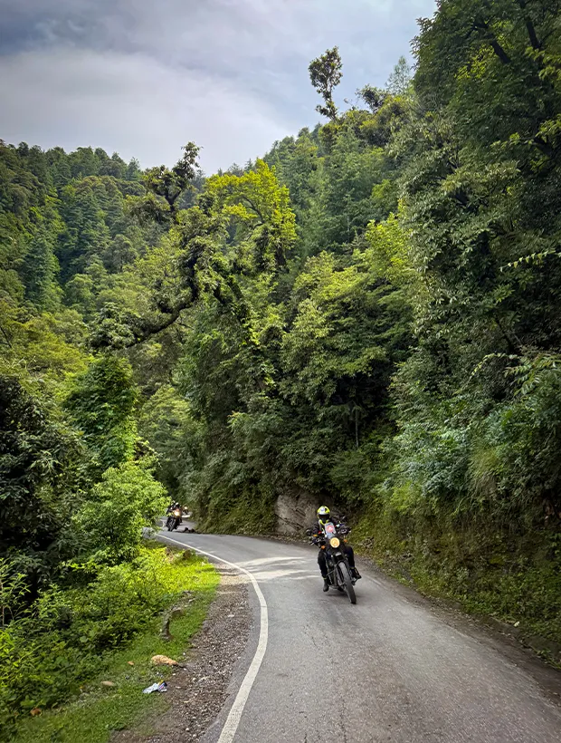 En route, we visit the Namgyal Monastery, where chants echo in the halls and prayer wheels spin endlessly, carrying centuries of faith in their rhythm. As the day winds down, we roll back to our hotel in Dharamshala. The night is alive with laughter and stories, before finally giving way to the quiet rest every rider needs for the road ahead.