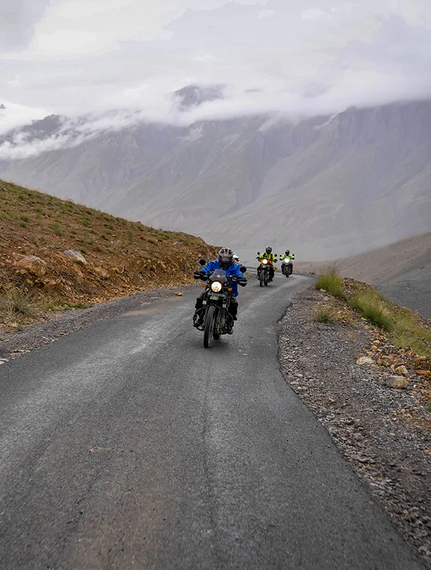 From here, we dive into the raw beauty of Spiti as we ride along the Kibber Wildlife Sanctuary, towards Losar. The road will challenge every bit of your riding skill: dirt trails, high cliffs, water crossings, hairpin turns, and the occasional blind spot. After Losar, a smooth tarred road welcomes us for a short break, but don't get too comfortable—it's back to rugged roads as we follow the legendary route where Royal Enfield's off-roading races are held. When we reach Kunzum La (4551m), take a moment to catch your breath and pay homage at Kunzum Mata Temple, a blessing for safe passage into the land of the gods.