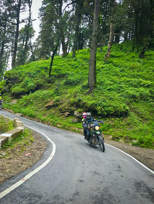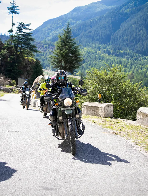 Hold tight as we ride through a dark tunnel, emerging at the Beas-Sainj confluence where the excitement truly kicks in. From here, narrow mountain roads will lead us towards Jibhi, cutting through pine-laden landscapes and jaw-dropping valley views. Feel the fresh mountain air as the crystal-clear streams follow us through the forests, and let the ride's mix of thrill and tranquility captivate you.