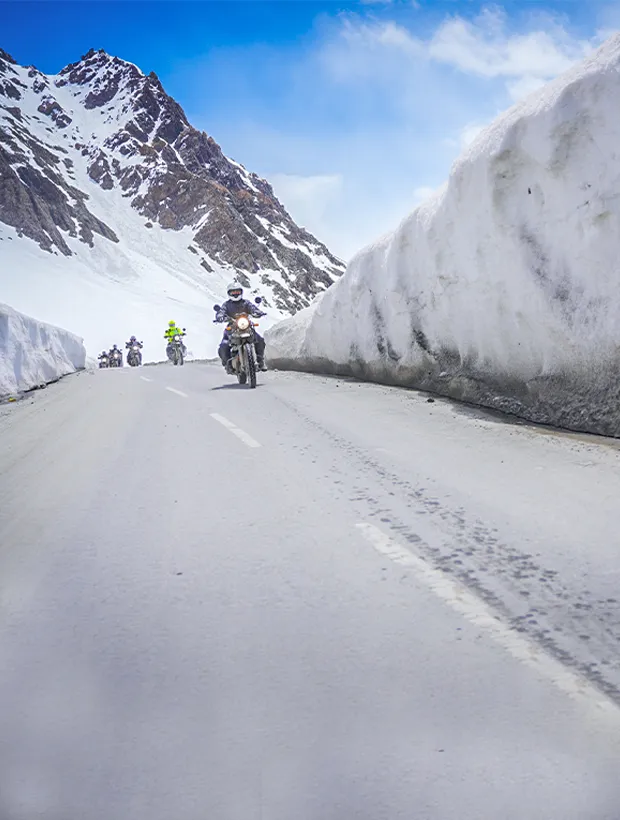 The sun rises gently over Sonamarg, casting golden light across your parked motorcycles. After a quick breakfast, helmets click shut and engines rumble to life. The roads of Sonamarg waste no time reminding you why this isn’t just a ride — it’s a test of grit. You climb swiftly toward the infamous Zoji La Pass, one of the most dramatic and high-altitude passes in India. With every twist, the terrain shifts into raw, barren cliffs. Snow walls cling to the roadside, and at times, it feels like you’re riding through a frozen gorge.