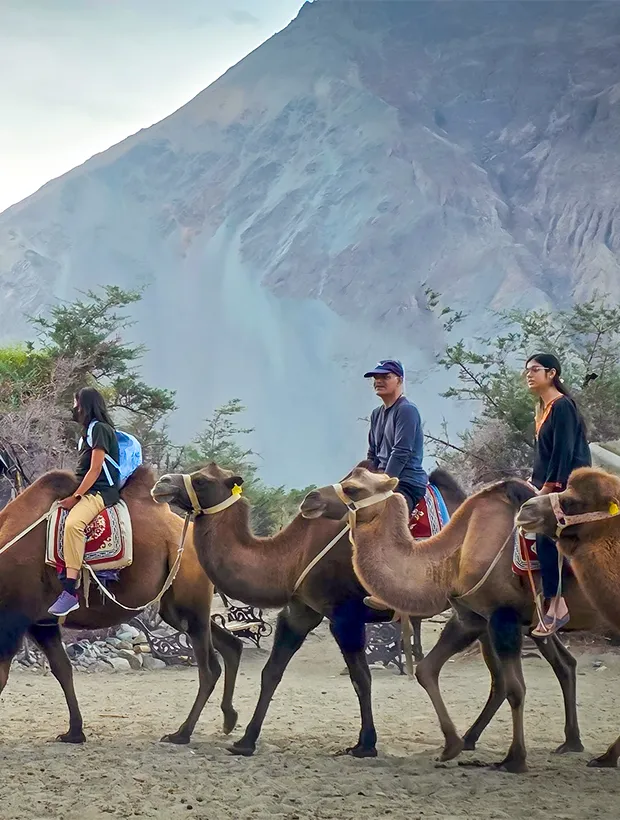 Explore the cold desert of Nubra Valley, where golden sand dunes lie in stark contrast to towering snow-capped peaks, and rare double-humped Bactrian camels roam freely across the surreal landscape.